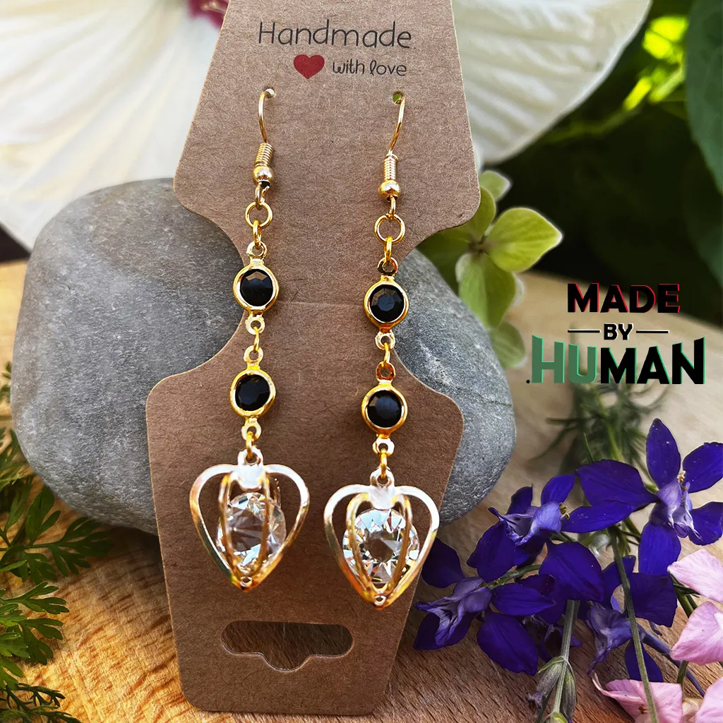 Hozd ki magadból a romantikát ezekkel a kézzel készített, aranyszínű szív fülbevalókkal, melyeket csillogó kristályok díszítenek! Az aranyszínű fém, a fekete kristályok és a szív formájú átlátszó kristályok kombinációja elegáns és kifinomult megjelenést biztosít minden alkalomra.