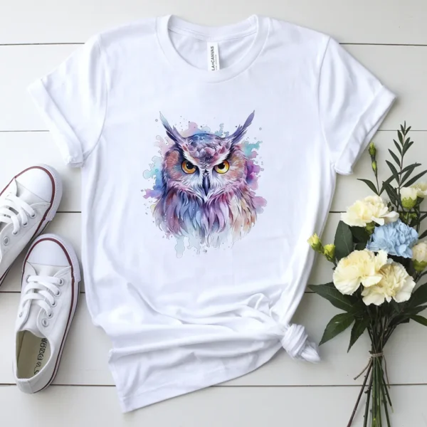 Egy titokzatos bagoly, akinek tollazata a hajnal és az alkony varázslatos árnyalataiban pompázik. Mély tekintete az éjszaka rejtelmeit és a természet végtelen bölcsességét sugározza, mintha őrizné az univerzum legmélyebb titkait.