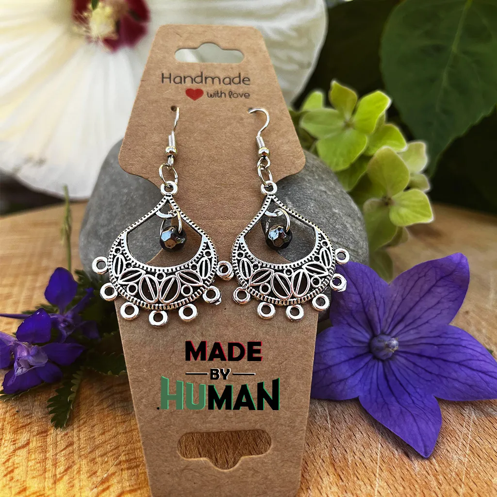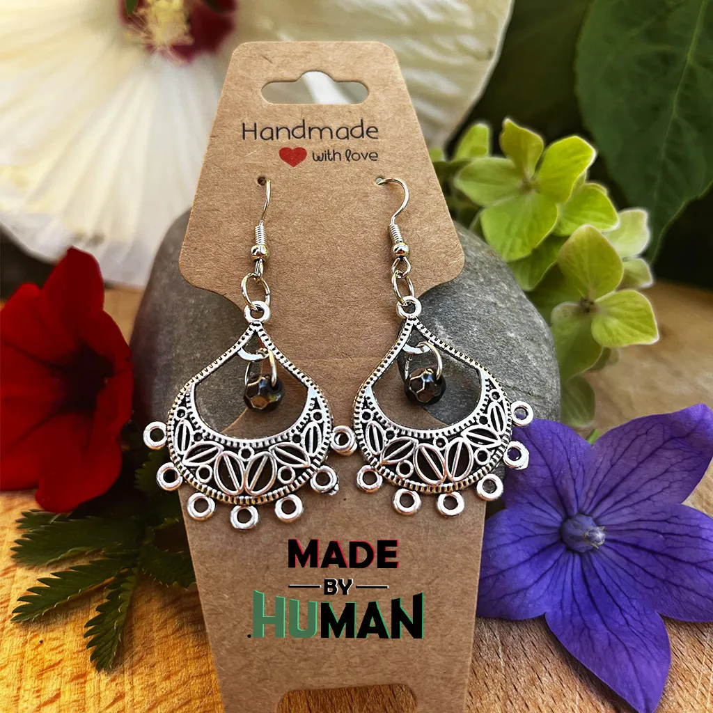 Hozz egy kis vintage hangulatot megjelenésedbe ezekkel a kézzel készített, elegáns gránit csepp fülbevalókkal! Az ezüstszínű bevonatú, filigrán mintázatú fém és a sötét gránit cseppek kombinációja egyedi és stílusos megjelenést biztosít minden alkalomra.
